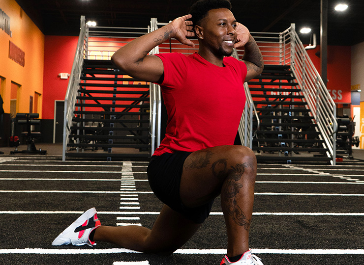 - Lower into a lunge until your right thigh is parallel to the floor.